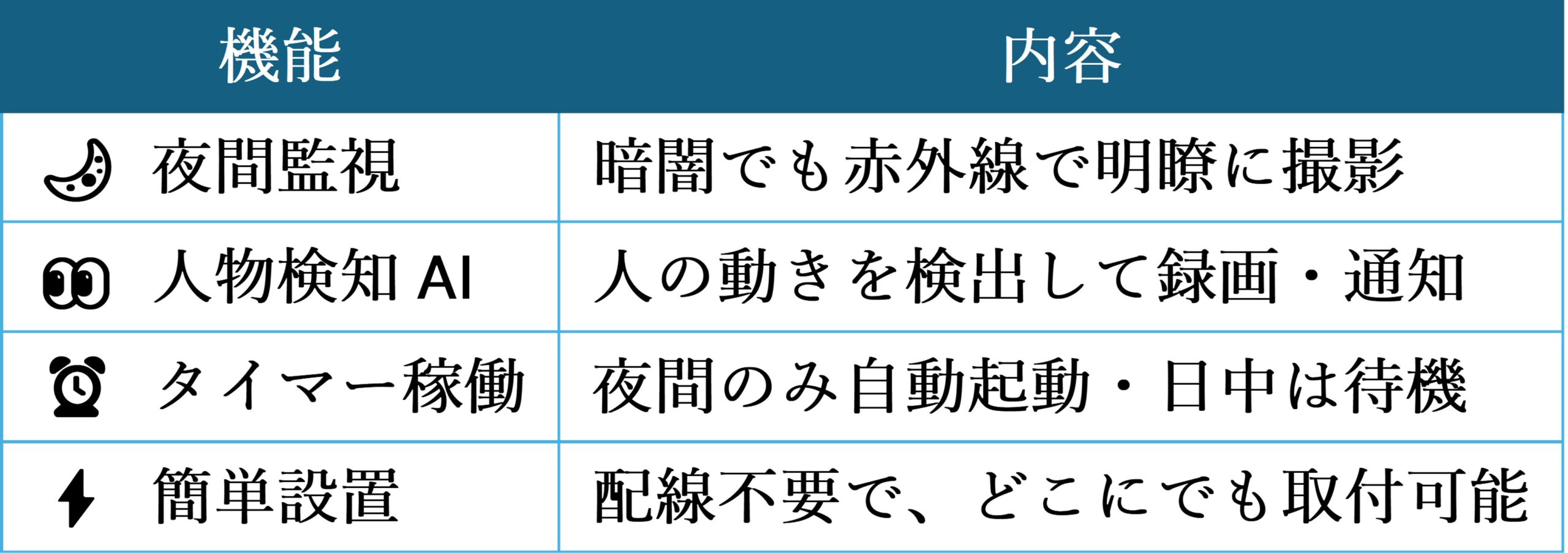 • AI-KIDsは夜間でも人物検知が可能で、タイマー設定や簡単設置も対応。