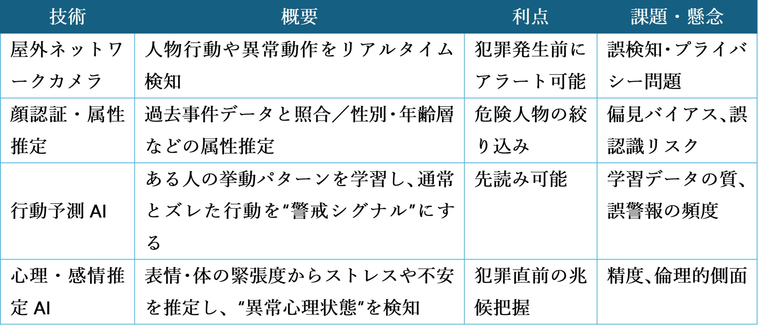 一方、こうした技術を使うには、誤警報を減らす精度、説明性(なぜそこを「危険」と判断したか)を担保すること、プライバシーや人権への配慮も含めた制度設計が不可欠です。