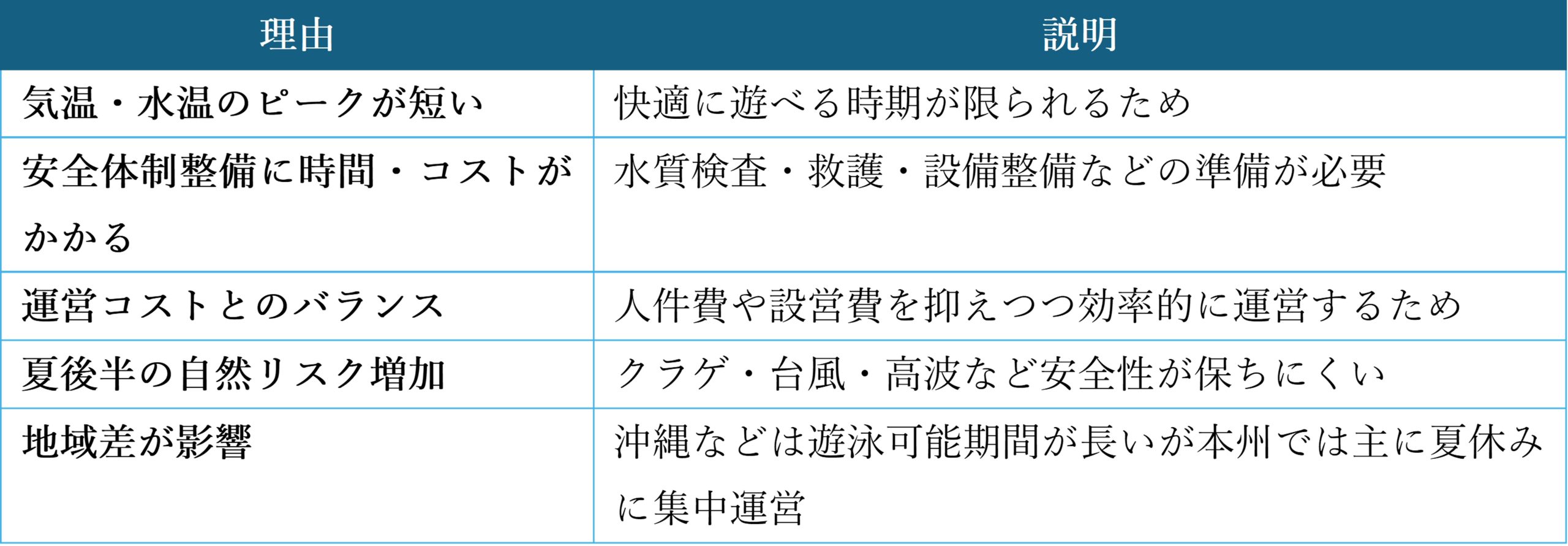その観点からも、夏休み期間(主に7~8月)に集中して営業するのが最も合理的という事情があります。