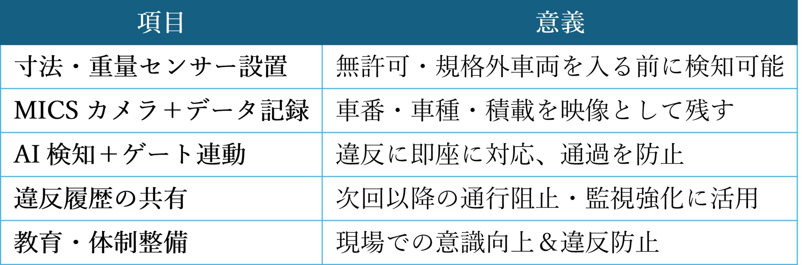• 現場教育を徹底:ドライバー・運送会社に対して「無許可通行の危険性」「道路構造物へのダメージ」「事故リスク」を共有。