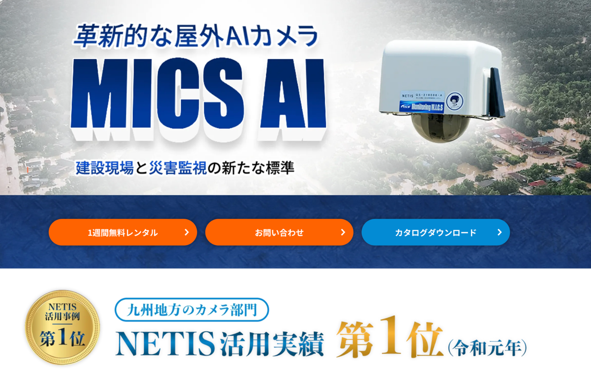 当社の主力製品「AI KIDs」「モニタリングミックス」「MICS AI」はすべて、NETIS登録製品。低コストで始められるAI防犯カメラから、遠隔臨場対応の高性能PTZカメラ、AI画像解析搭載の最上位モデルまで、現場の課題に合わせて最適な製品をご提案します。